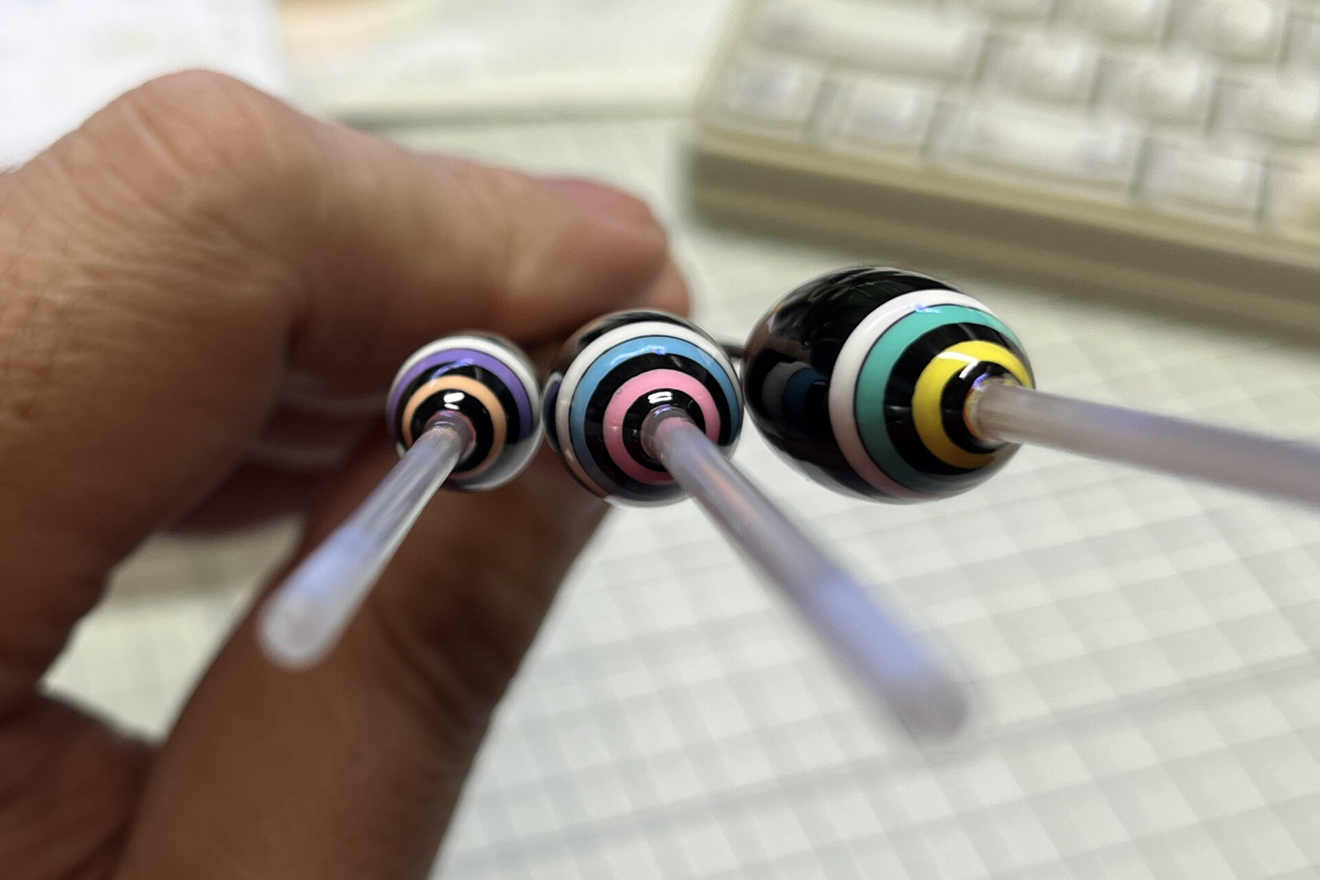 孔雀羽根1本取りはクリアー仕上げ、帯は明るめの色調です。カヤボディはブラック塗装で、帯は暗めの色調です。両者共に細い順に並べれば、グラデーションになるような配色になっています。帯下のメタリックラインは、金がS、銀がM、銅がLサイズを表しています。